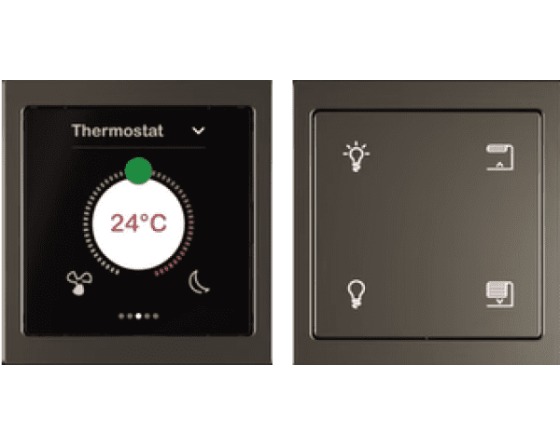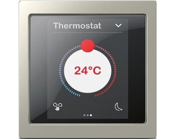 KNX Multitouch Pro, pour la conception du système. Régulateur d'ambiance confortable pour contrôler jusqu'à 32 fonctions d'ambiance et la température ambiante Toutes les fonctions sont affichées sur un écran tactile et sont appelées par de simples mouvements des doigts. L'utilisateur choisit parmi 3 conceptions d'interface qui peuvent être librement attribuées aux fonctions de la salle Le contrôle de la température ambiante peut être présenté dans 2 modèles différents. Avec régulateur de température ambiante, affichage et connexion pour la sonde à distance Le régulateur de température ambiante peut être utilisé pour le chauffage et la climatisation avec des entraînements de vanne KNX réglables en continu ou pour déclencher des actionneurs de commutation et des actionneurs de chauffage Fonctions de l'appareil ETS: