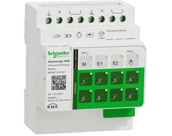 Ce maître de variation universelle SpaceLogic KNX permet d'actionner la variation. Il dispose de 2 canaux pour la commutation et la variation de lampes LED à variation, lampes à incandescence, lampes halogènes HT, lampes halogènes BT. Ces lampes utilisent des transformateurs à variation d'intensité ou des transformateurs électroniques ou des lampes fluorescentes compactes à variation d'intensité.