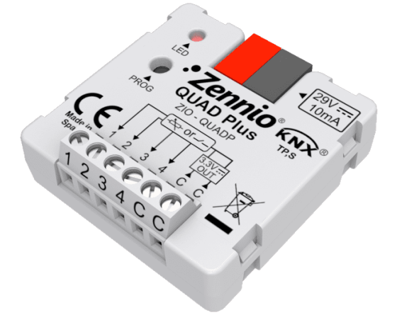Capteur analogique / numérique. QUAD Plus est un capteur analogique – numérique qui offre une multitude de fonctionnalités. Il dispose de 4 entrées pouvant être configurées comme entrées binaires multifonction opto-couplées pour capteurs et interrupteurs libre de potentiel, comme sonde de température avec thermostat de zone pour le contrôle des circuits de froid/chaud, et comme entrée de détection de mouvement. Accessoires : Sondes de température et détecteur de mouvement.