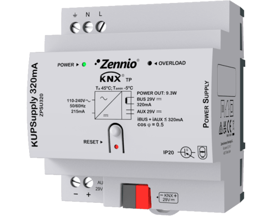 Source d’alimentation universel KNX (29 V DC, bobine incluse) avec alimentation auxiliaire de 29 V DC qui fournit jusqu’à 320 mA d’alimentation au bus KNX. Tension d’alimentation de 110-240 V ~ 50/60 Hz. Installation sur rail DIN 4,5 unités.