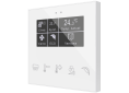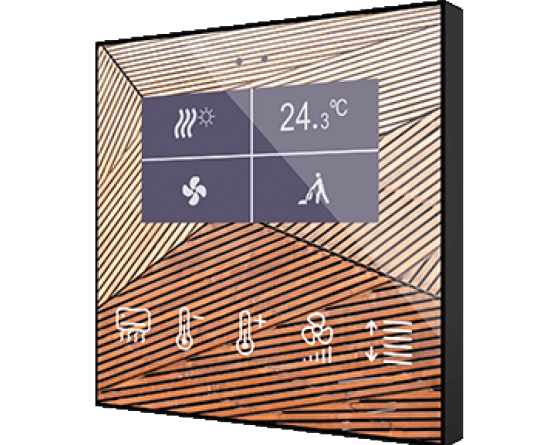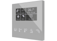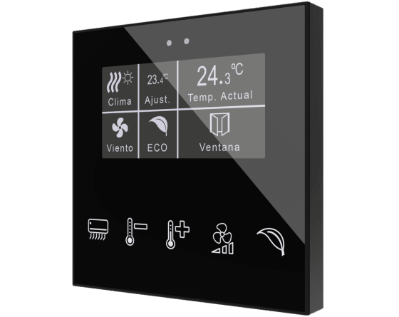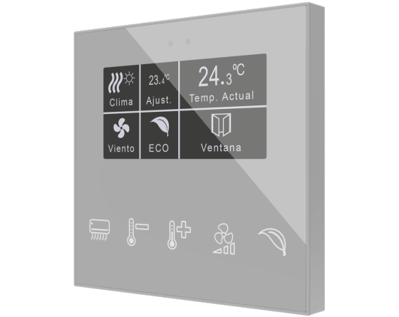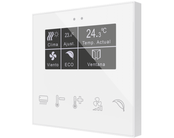 Panneau tactile capacitif rétro-éclairé de la famille Flat, avec un capteur de proximité et capteur d'humidité, design plat (9 mm) et totalement personnalisable. N'importe qui peut créer des compositions uniques incluant des images, des icônes, des textes. Cette personnalisation est basée sur une impression professionnelle sur du verre trempé de grande résistance. Le contrôle de la pièce est concentré sur 5 boutons disponibles et jusqu'à 8 indicateurs peuvent être affichés sur son écran de 2.4". Les icônes rétro-éclairés régulent leur luminosité avec le détecteur de luminosité ambiante et s'atténuent lorsque l'utilisateur n'est plus détecté par le capteur de proximité. Le Flat Display v2 dispose d'une sonde interne de température, d'un capteur d'humidité et d'un thermostat, avec 2 entrées analogiques-numériques qui peuvent être configurées comme entrée binaire pour capteur ou bouton poussoir libre de potentiel, comme sonde de température o