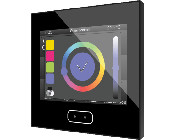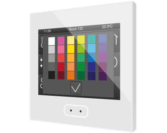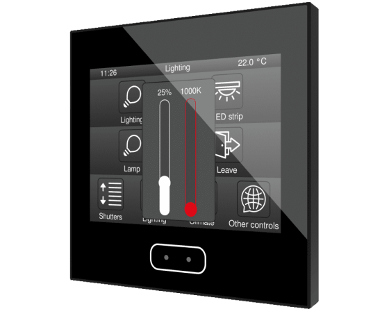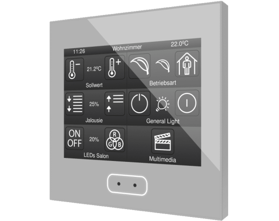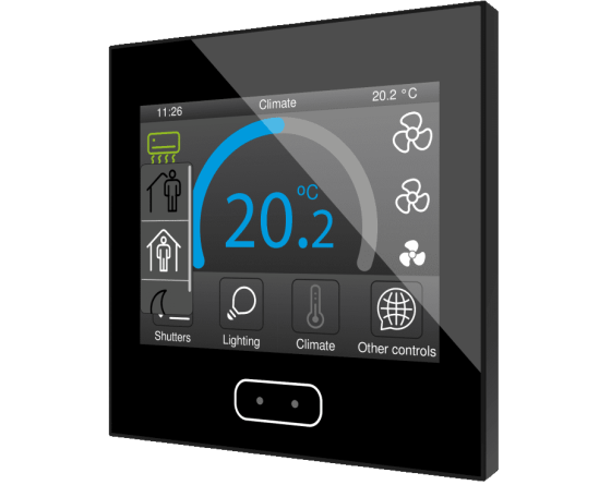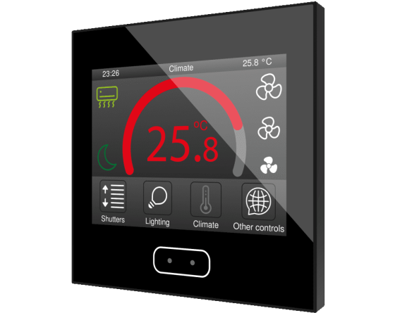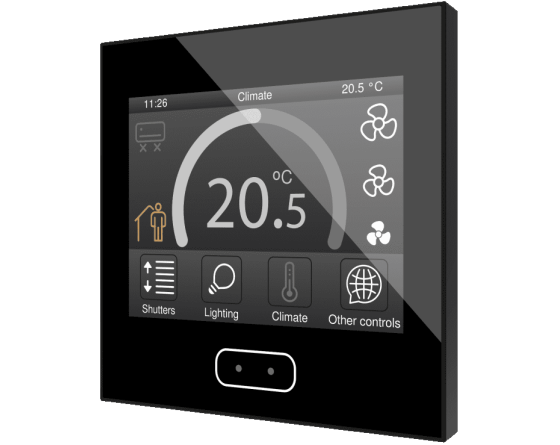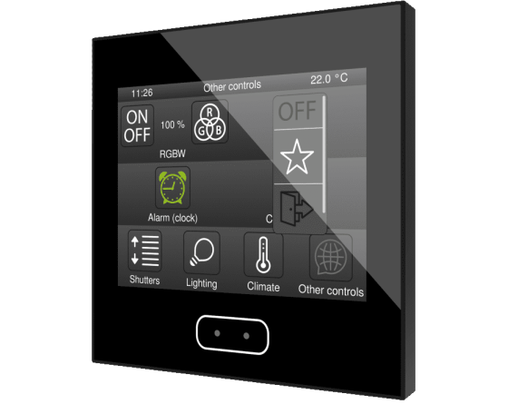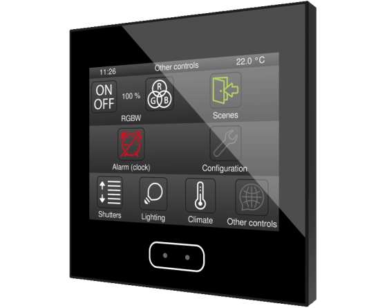 Écran tactile capacitif avec écran rétro-éclairé de 3.5”, capteur de proximité, sonde interne de température et thermostats pour deux zones indépendantes. Il permet d'avoir jusqu'à 56 contrôles/indicateurs distribués sur jusqu'à 7 pages avec un menu de navigation. L'écran de veille avec image, heure, date et/ou température apparaît lorsque l'écran tactile n'est plus utilisé et il disparaît automatiquement pour afficher les contrôles lorsque l'utilisateur s'approche, grâce à son capteur de proximité. Sa luminosité est régulée automatiquement avec le capteur de luminosité inclus. Il dispose de 4 entrées analogiques-numériques qui peuvent être configurées comme entrée binaire pour capteur ou bouton poussoir libre de potentiel, comme sonde de température ou détecteur de mouvement. Disponible en Blanc, Anthracite et Argent. Accessoires: Sondes de température et détecteur de mouvement.