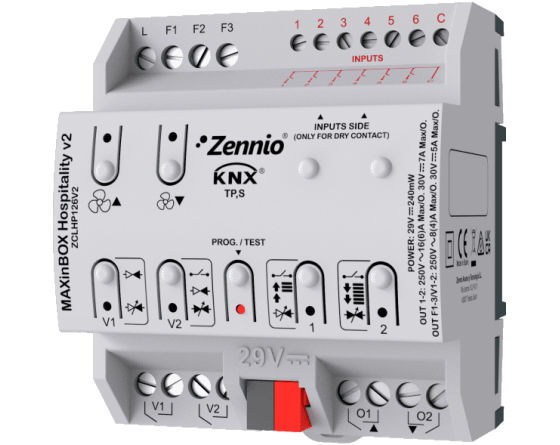 Le MAXinBOX Hospitality v2 est un contrôleur de ventilo-convecteur de 2 ou 4 tubes avec vanne tout-ou-rien ou de 3 points et jusqu’à trois vitesses de ventilation, pour rail DIN (4,5 unités). Il inclut 2 sorties indépendantes de relais de 16 A C-Load qui peuvent être configurées comme sorties individuelles ou comme canal de volets. De plus, il dispose de 6 entrées analogiques-numériques qui peuvent être configurées comme entrées binaires multifonction, pour des capteurs et boutons poussoirs libres de potentiel, comme entrées de sondes de température ou comme entrées de détecteurs de mouvement. Fonction Master Light incorporée. Il inclut un module de 10 fonctions logiques et il permet le contrôle manuel de toutes les sorties, avec indication d’état au moyen de LEDs. Accessoires : Sondes de température et détecteur de mouvement.