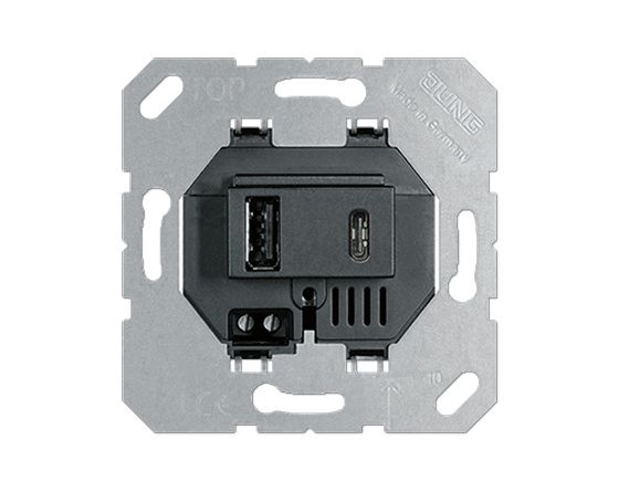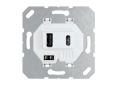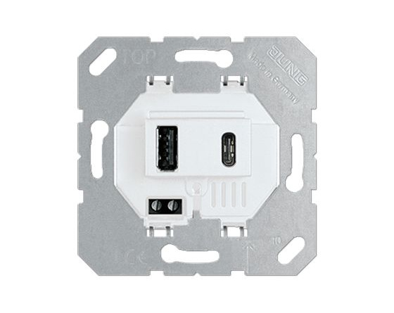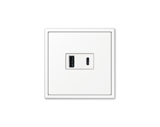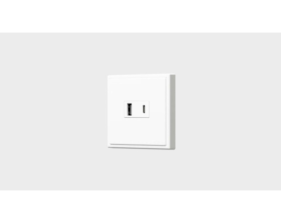 Chargeur mural avec 1 prise USB type A et une prise USB type C délivrant une tension de 5V DC et unun courant maximal de 3000mA.